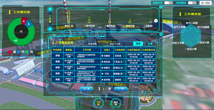 接入電廠的兩票系統(tǒng)和缺陷系統(tǒng)數(shù)據(jù),只篩選出當日正在執(zhí)行的兩票和未完成的缺陷。根據(jù)兩票和缺陷的內(nèi)容通過提前預(yù)設(shè)好的KKS編碼和關(guān)鍵字關(guān)聯(lián)到設(shè)備或者區(qū)域上,實現(xiàn)兩票和缺陷分區(qū)域分布顯示。將兩票中風險等級高的進行報警顯示,提醒安全管理人員注意。