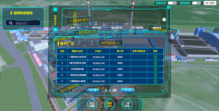 接入電廠現(xiàn)有的視頻監(jiān)控系統(tǒng)、門禁系統(tǒng)以及項目現(xiàn)場建設(shè)的定位設(shè)備,實現(xiàn)定位設(shè)備、視頻監(jiān)控設(shè)備、門禁設(shè)備的區(qū)域分布,三維可視化分布、設(shè)備快速查找、視頻快速調(diào)取、門禁日志快速查詢的功能。